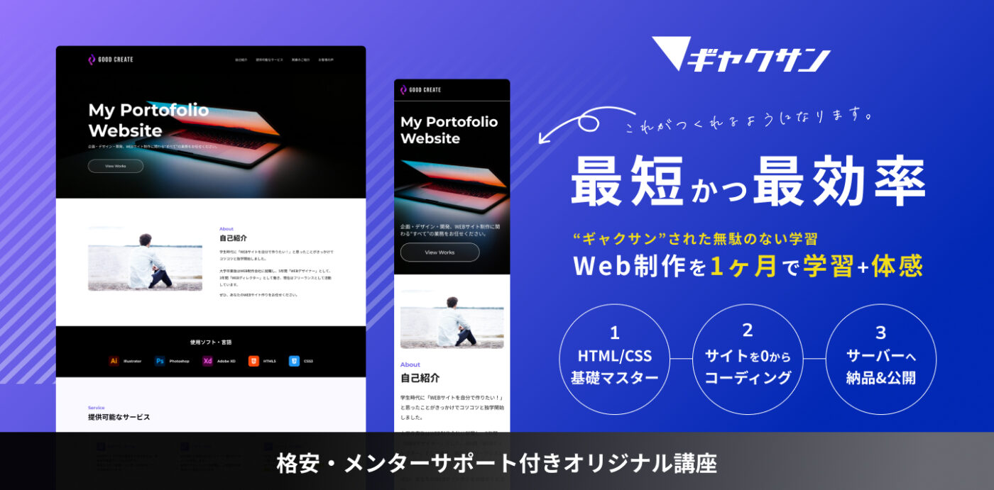 最後にはポートフォリオサイトの完全版のデザインデータとコーディングの正解コードを元に課題に取り組んでもらいます。